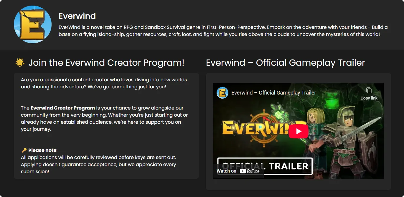 Basically, we targeted creators who played similar games: Minecraft, Valheim, Raft - all those kinds of survival games because they resonate with our audience. And when we checked stats from previous campaigns, we saw that it was the same audience. People who played those games are very likely to want to play Everwind.