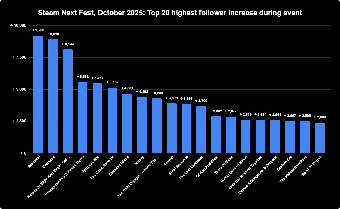 While it was an excellent fifth place in the player number department, REANIMAL actually topped the charts in a couple of important metrics. Analysis by the team at GameDiscoverCo found that Tarsier’s game led the way when it came to both the number of wishlist increases (+177,025) and the number of followers added (+9,208). Check out these graphs.
